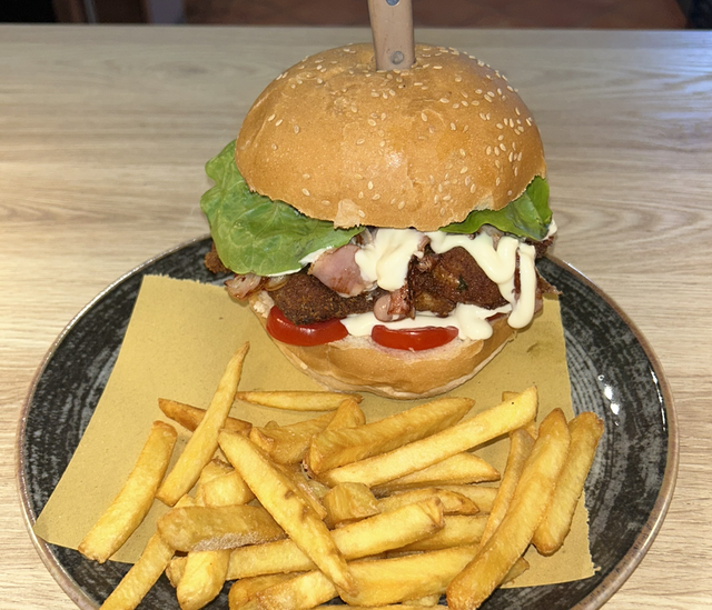Bun artigianale, sovracoscia di pollo, bacon, pomodoro, maionese, insalata, salsa alla birra